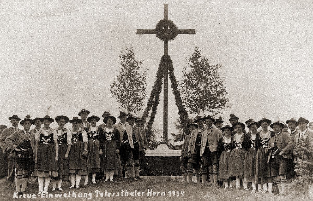 Ihre eigene, 520 Mark teure, Vereinsfahne durften die Petersthaler Trachtler am 30. August 1936 unter der Patenschaft des Trachten – und Heimatvereines Waltenhofen bei einem großen Fest mit 27 teilnehmenden Vereinen einweihen.